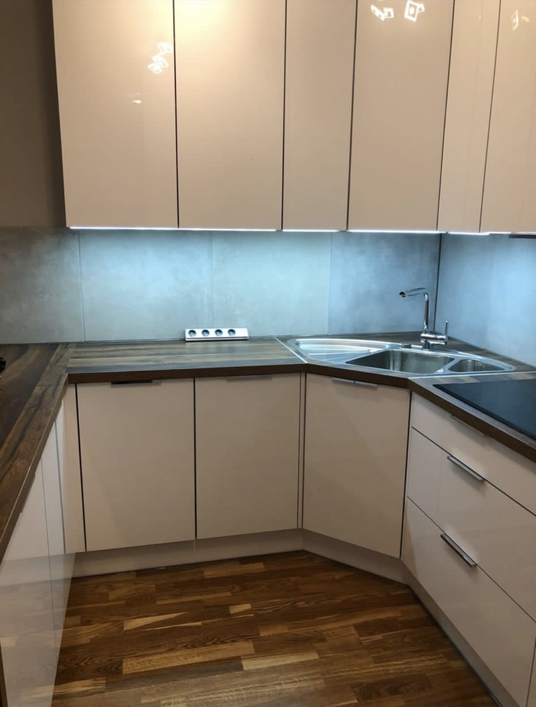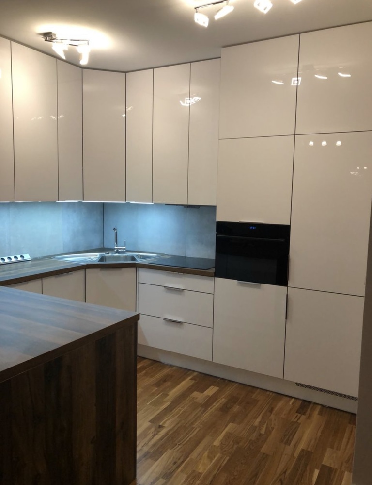 Wysokiej jakości meble kuchenne, drewniana podłoga oraz drzwi pokojowe.