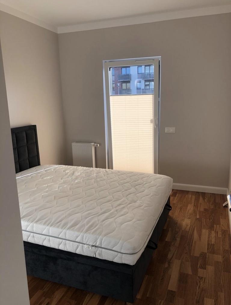 Nowe osiedle, nadal rozbudowywane. Między budynkami duża przestrzeń z darmowymi miejscami parkingowymi.
