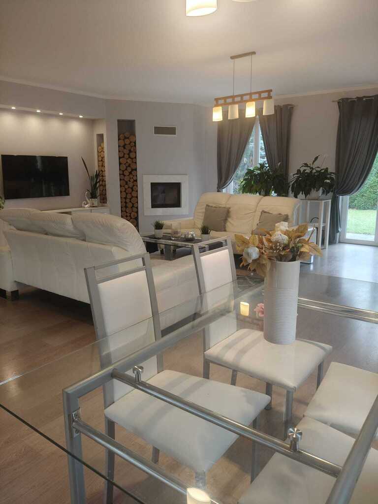 Na parterze znajduje się przestronny hol z dużą, zabudowaną szafą. Przeszklone drzwi prowadzą stąd do reprezentacyjnego salonu ( ok 50m2) z kominkiem, który posiada system rozprowadzenia ciepła do dwóch pokoi na piętrze. Z salonu można wyjść bezpośrednio do ogrodu. Na tym poziomie znajduje się również oddzielny gabinet – idealny do pracy zdalnej lub jako pokój gościnny. Do kuchni prowadzą przesuwne drzwi, które dają właścicielom dużą elastyczność w aranżacji wnętrza. Na parterze znajduje się również łazienka z WC i kabiną prysznicową, a także kotłownia z zejściem do piwnicy. W oknach parteru zamontowano rolety antywłamaniowe, natomiast w piwnicy oraz kotłowni – szyby antywłamaniowe. Parter prócz gabinetu posiada ogrzewanie podłogowe.